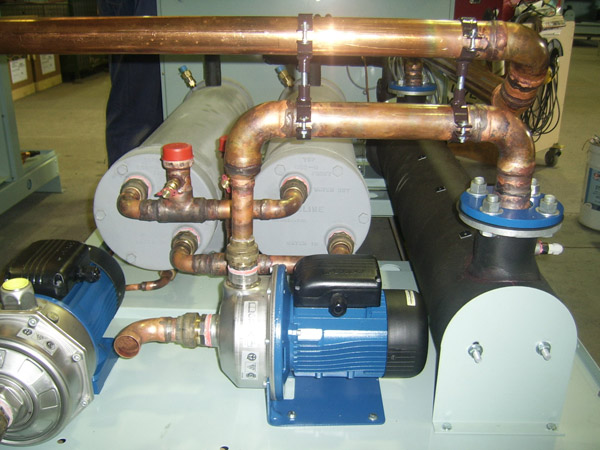 DX chillers range in capacity from 18 to 350 Kw capacity. They are unique in that they are made with “U” shaped tubes which enable cleaning of the water side. Robust in construction and serviceable, they are built to last. The water side can pass quite large particles of matter without obstruction thus maintaining its efficiency; an important factor in the long life of the unit.